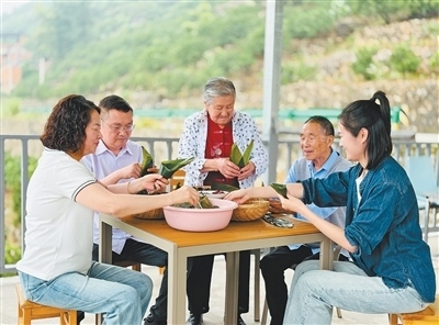 一家三代人,一邊包粽子,一邊聊家常。