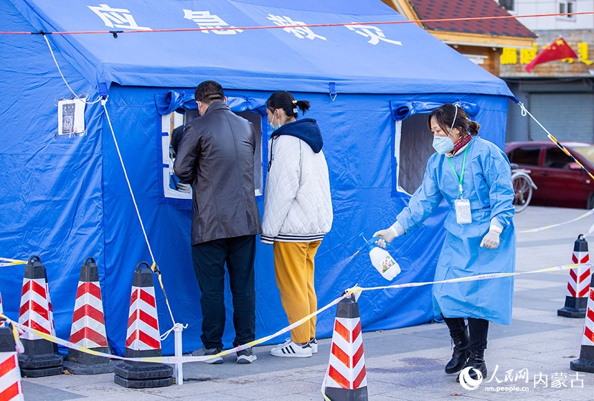 呼和浩特市玉泉區(qū)一處核酸篩查點(diǎn),社區(qū)工作者對(duì)核酸采樣現(xiàn)場進(jìn)行消殺。丁根厚攝