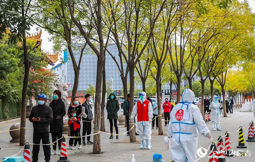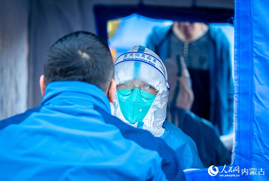 呼和浩特市玉泉區(qū)一處核酸采樣點(diǎn),醫(yī)護(hù)人員為居民進(jìn)行核酸檢測。丁根厚攝