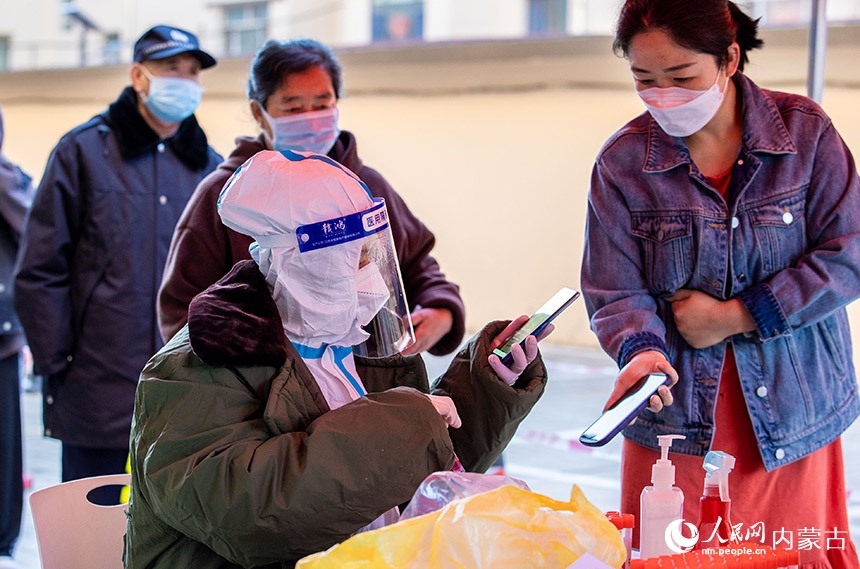 呼和浩特市玉泉區(qū)一處住宅小區(qū),社區(qū)網(wǎng)格員在查驗(yàn)準(zhǔn)備去核酸檢測點(diǎn)居民的健康碼。丁根厚攝