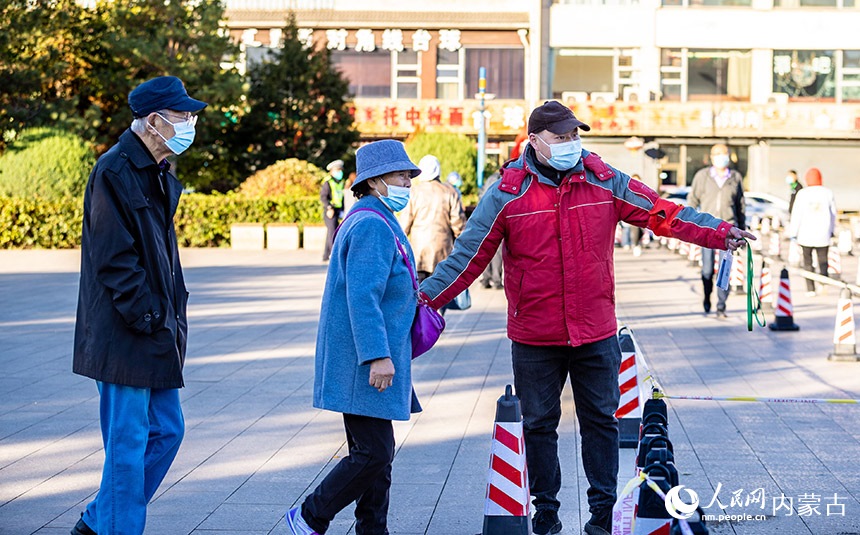 呼和浩特市玉泉區(qū)一處核酸篩查點(diǎn),工作人員引導(dǎo)老年人通過綠色通道接受核酸檢測。丁根厚攝