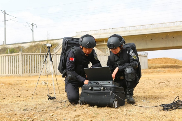 特警信息組對(duì)附近地形進(jìn)行勘測 湯彥冬 攝