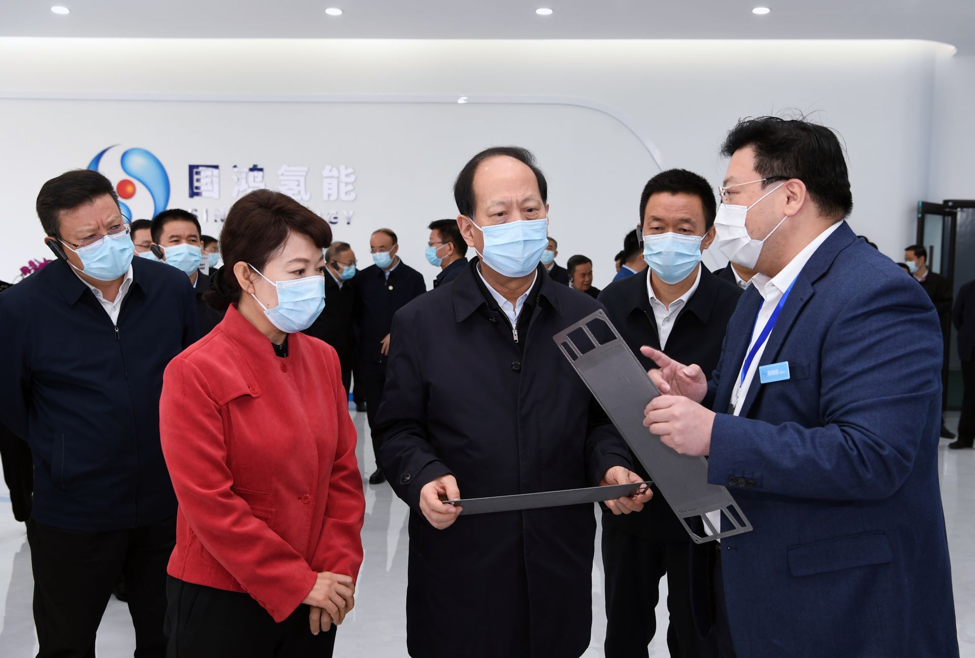 4月8日,自治區(qū)黨委書(shū)記、人大常委會(huì)主任石泰峰,自治區(qū)黨委副書(shū)記、自治區(qū)主席王莉霞,與參加自治區(qū)推進(jìn)高質(zhì)量發(fā)展重大項(xiàng)目建設(shè)動(dòng)員大會(huì)代表一起觀摩國(guó)鴻氫能科技有限公司鴻氫能商用車(chē)動(dòng)力系統(tǒng)集成生產(chǎn)項(xiàng)目。內(nèi)蒙古日?qǐng)?bào)社融媒體記者 袁永紅 攝
