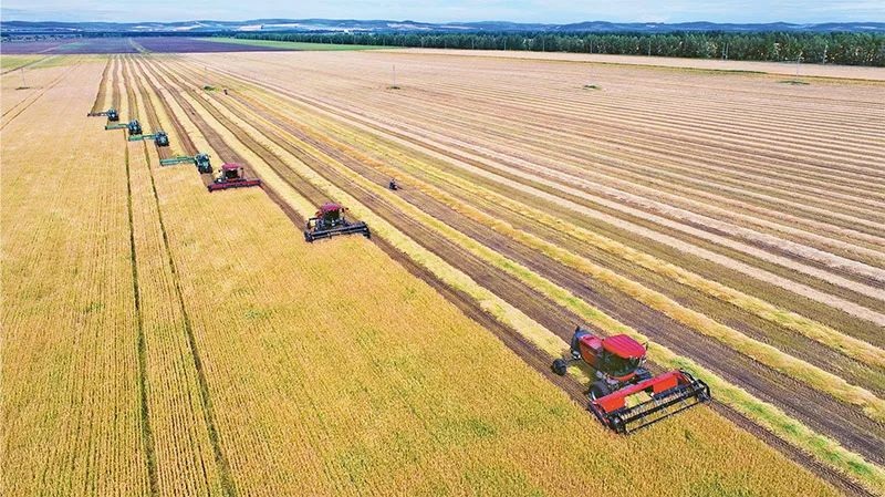 實施鄉(xiāng)村振興戰(zhàn)略,必須把確保重要農(nóng)產(chǎn)品特別是糧食供給作為首要任務,把提高農(nóng)業(yè)綜合生產(chǎn)能力放在更加突出的位置,把“藏糧于地、藏糧于技”真正落實到位。圖為2022年8月17日,大型秋收機械在內(nèi)蒙古呼倫貝爾農(nóng)墾牙克石農(nóng)牧場有限公司第四連(隊)集群割曬作業(yè)。人民圖片王國印/攝