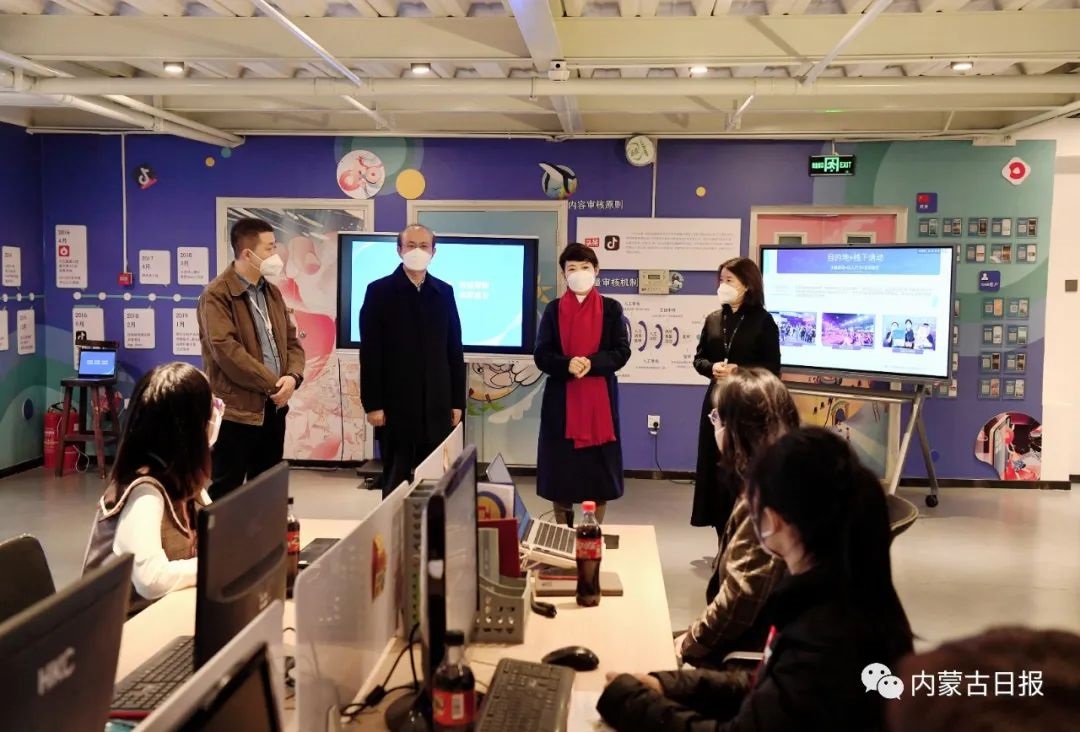 1月28日下午,王莉霞在抖音集團(tuán)內(nèi)蒙古公司了解新媒體制作、審核、傳播等工作流程。記者韓卿立攝