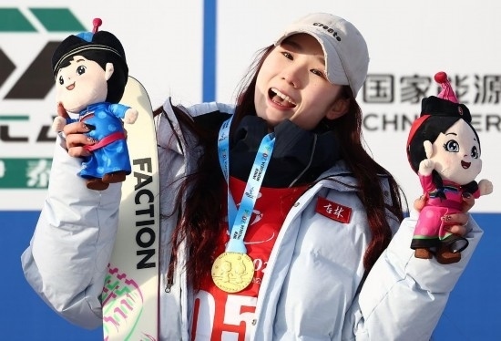 劉夢婷的雪板上有一個“谷”字,她解釋說這是谷愛凌同款定制雪板?!拔液芟矚g她的風格,把她作為我的榜樣,激勵我進步?!?/p>
