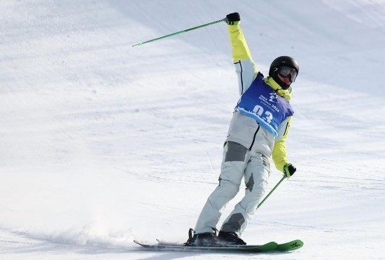 2月17日,內蒙古隊選手楊昊在比賽中慶祝,他以174.75分的成績獲得冠軍。新華社記者 王楷焱 攝