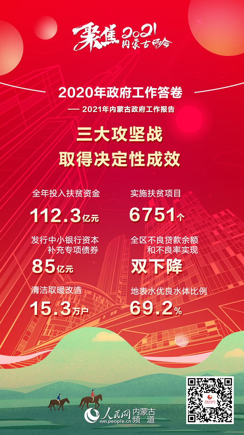 1月26日上午,內(nèi)蒙古自治區(qū)十三屆人大四次會(huì)議在內(nèi)蒙古人民會(huì)堂開(kāi)幕。自治區(qū)主席布小林作政府工作報(bào)告。2020年是極不平凡的一年,內(nèi)蒙古緊扣全面建成小康社會(huì)目標(biāo)任務(wù),堅(jiān)持穩(wěn)中求進(jìn)工作總基調(diào),堅(jiān)持以人民為中心,科學(xué)統(tǒng)籌疫情防控和經(jīng)濟(jì)社會(huì)發(fā)展,扎實(shí)做好“六穩(wěn)”工作,全面落實(shí)“六?!比蝿?wù),全區(qū)經(jīng)濟(jì)持續(xù)回穩(wěn),社會(huì)大局和諧穩(wěn)定,“十三五”規(guī)劃順利收官。2020年政府工作有哪些亮點(diǎn)?看內(nèi)蒙古書寫這份精彩答卷!