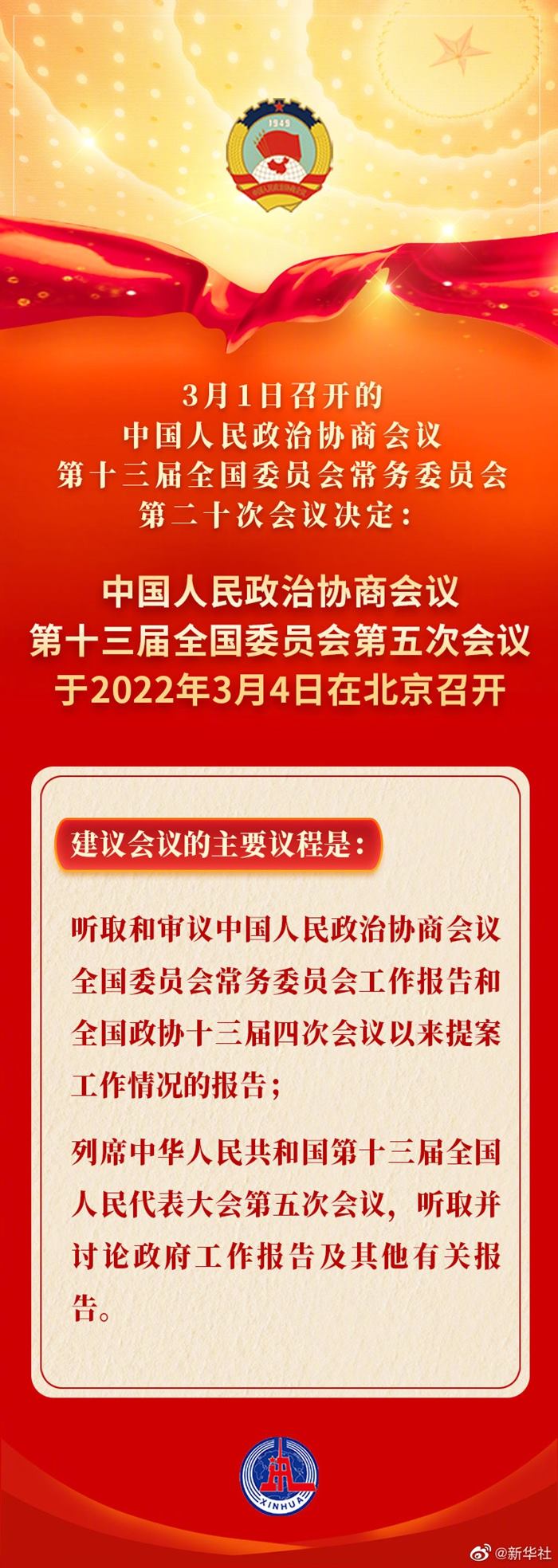 3月1日召開的中國人民政治協(xié)商會議第十三屆全國委員會常務(wù)委員會第二十次會議決定:中國人民政治協(xié)商會議第十三屆全國委員會第五次會議于2022年3月4日在北京召開。建議會議的主要議程是:聽取和審議中國人民政治協(xié)商會議全國委員會常務(wù)委員會工作報告和全國政協(xié)十三屆四次會議以來提案工作情況的報告;列席中華人民共和國第十三屆全國人民代表大會第五次會議,聽取并討論政府工作報告及其他有關(guān)報告。