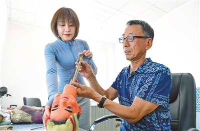 靳媛在原呼和浩特市玉泉區(qū)木偶劇團演員張曉紅(右)指導(dǎo)下修復(fù)木偶。