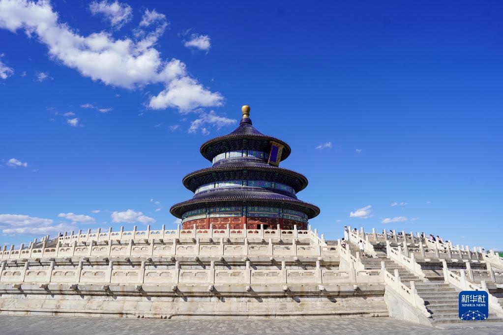 這是藍天白云下的北京天壇祈年殿(2021年6月4日攝)。