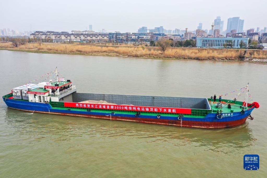 “船聯(lián)1號”電動貨船在長江南京段航行(2月22日攝,無人機照片)。