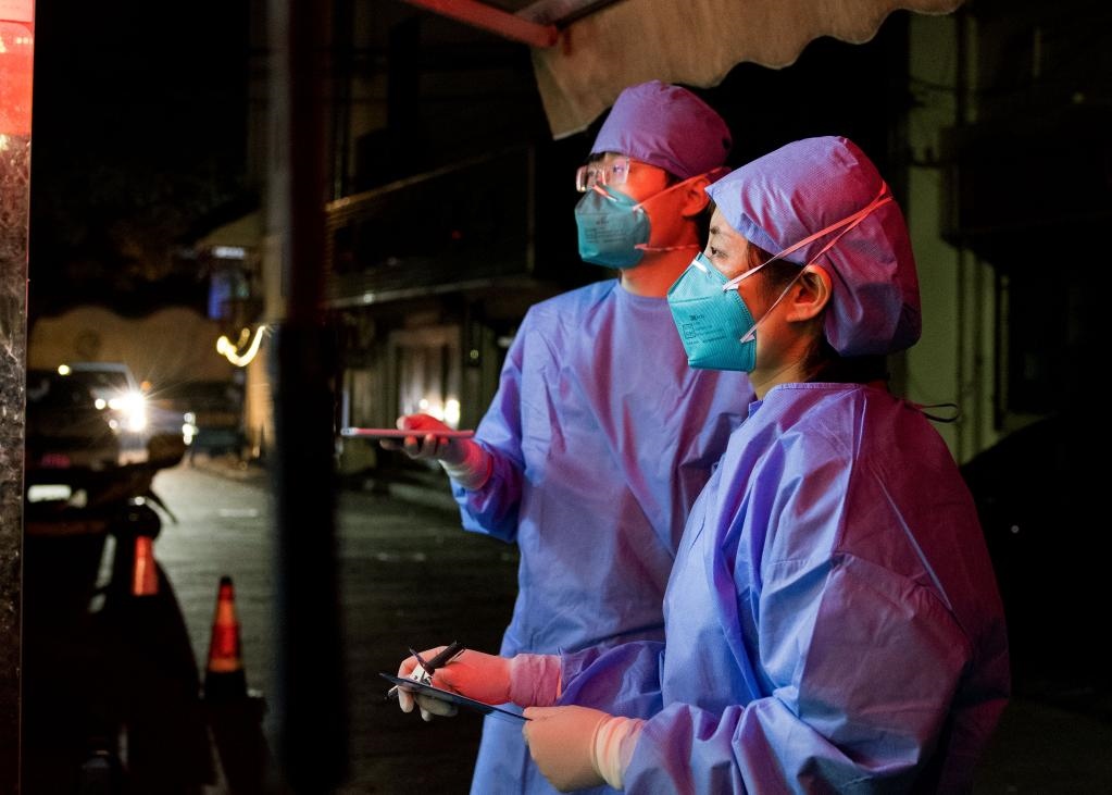 3月16日晚,流調人員在進行軌跡排查。新華社記者劉穎攝