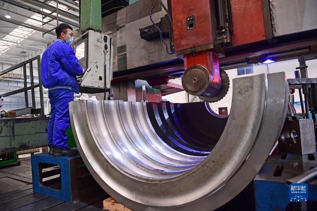 2020年3月16日,在沈陽鼓風(fēng)機集團股份有限公司生產(chǎn)車間,工人操作機器加工產(chǎn)品內(nèi)機殼。新華社記者 楊青 攝
