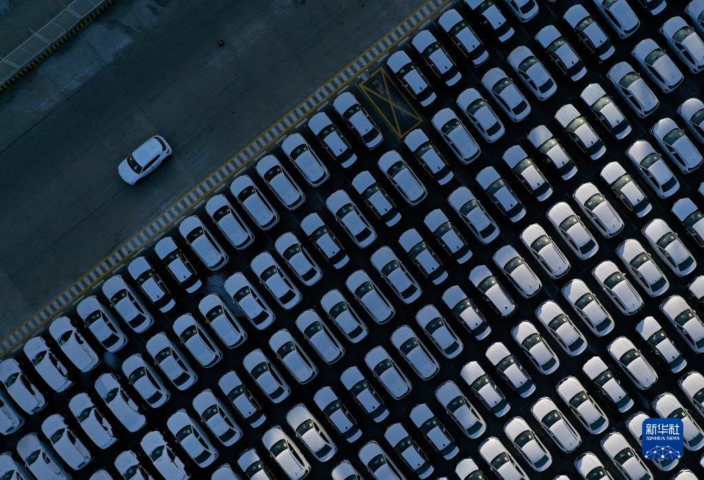 2021年1月29日,一輛運送中的商品車行駛在大連港汽車碼頭(無人機照片)。新華社記者 姚劍鋒 攝