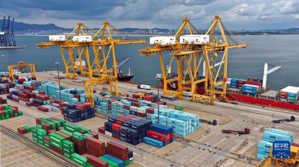 2020年9月24日,貨輪在大連港大連集裝箱碼頭有限公司港口裝卸集裝箱(無人機照片)。新華社記者 姚劍鋒 攝
