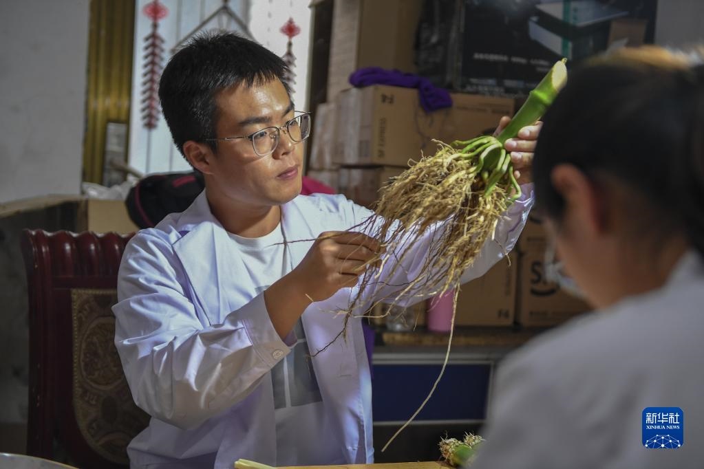 2021年8月2日,在吉林省梨樹縣四棵樹鄉(xiāng)三棵樹村“科技小院”,中國農業(yè)大學學生沙野查看玉米根系樣本。新華社記者 張楠 攝