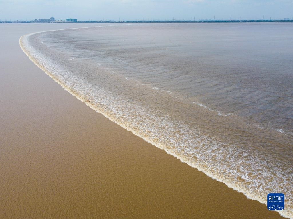 這是在杭州市錢(qián)塘新區(qū)拍攝的錢(qián)塘江一線(xiàn)潮奇觀(2020年10月5日攝,無(wú)人機(jī)照片)。新華社記者 江漢 攝