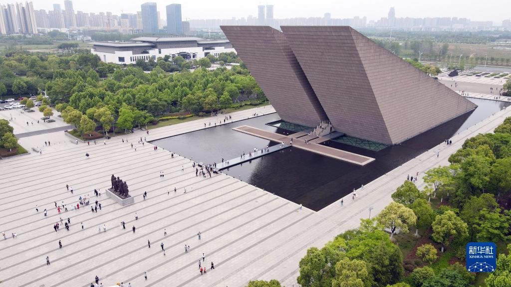 游客在渡江戰(zhàn)役紀(jì)念館參觀游覽(2021年5月3日攝,無人機(jī)照片)。新華社記者 周牧 攝