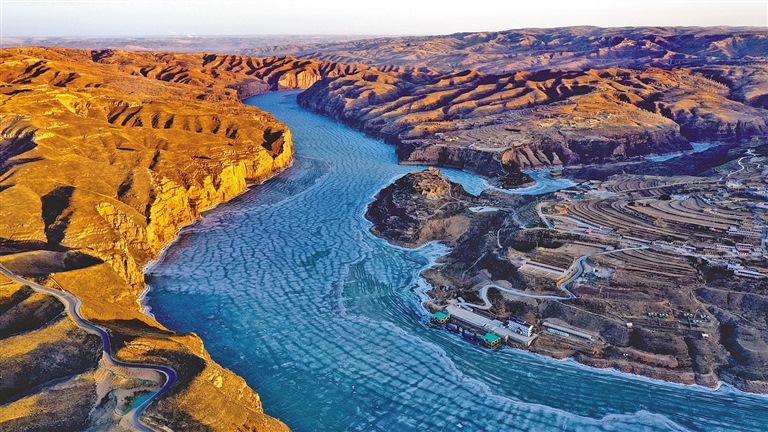 準(zhǔn)格爾黃河大峽谷,龍鱗狀的藍色冰面,猶如一條長龍蜷伏于崇山峻嶺間。文/圖 徐秋利