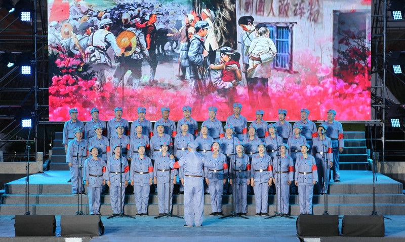 “唱支山歌給黨聽,我把黨來比母親,母親只生了我的身,黨的光輝照我心......”雨后的舞臺煥然一新,一首首耳熟能詳?shù)母锩枨?,把人們的思緒瞬間拉回歷史的長河,手中揮舞著一面面鮮艷的五星紅旗,點亮了整個夜晚。