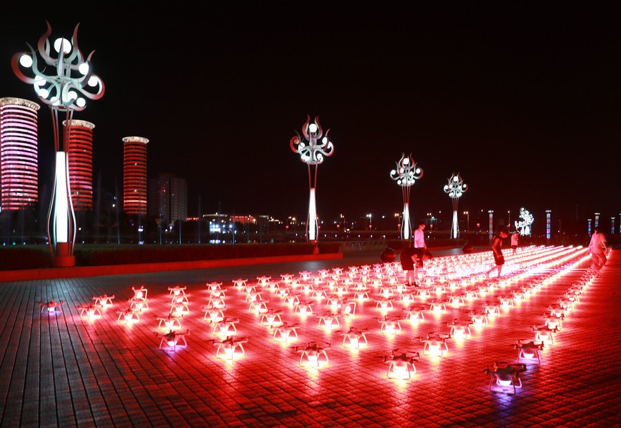 7月30日凌晨1:10,500架無人機(jī)在呼和浩特東河廣場騰空而起,如點(diǎn)點(diǎn)星光組成的動(dòng)態(tài)燈光秀,幻化成20余幅震撼畫面,“建設(shè)亮麗內(nèi)蒙古,共圓偉大中國夢”、“江山就是人民,人民就是江山”、“一心聽黨話,鐵心跟黨走”、“草原兒女心向黨”、“蒙古馬精神”、“亮麗內(nèi)蒙古”、“美麗青城草原都市”等一幅幅絢麗的文字和畫面,配上動(dòng)感激昂的音樂,效果驚艷,現(xiàn)場觀眾贊嘆連連。